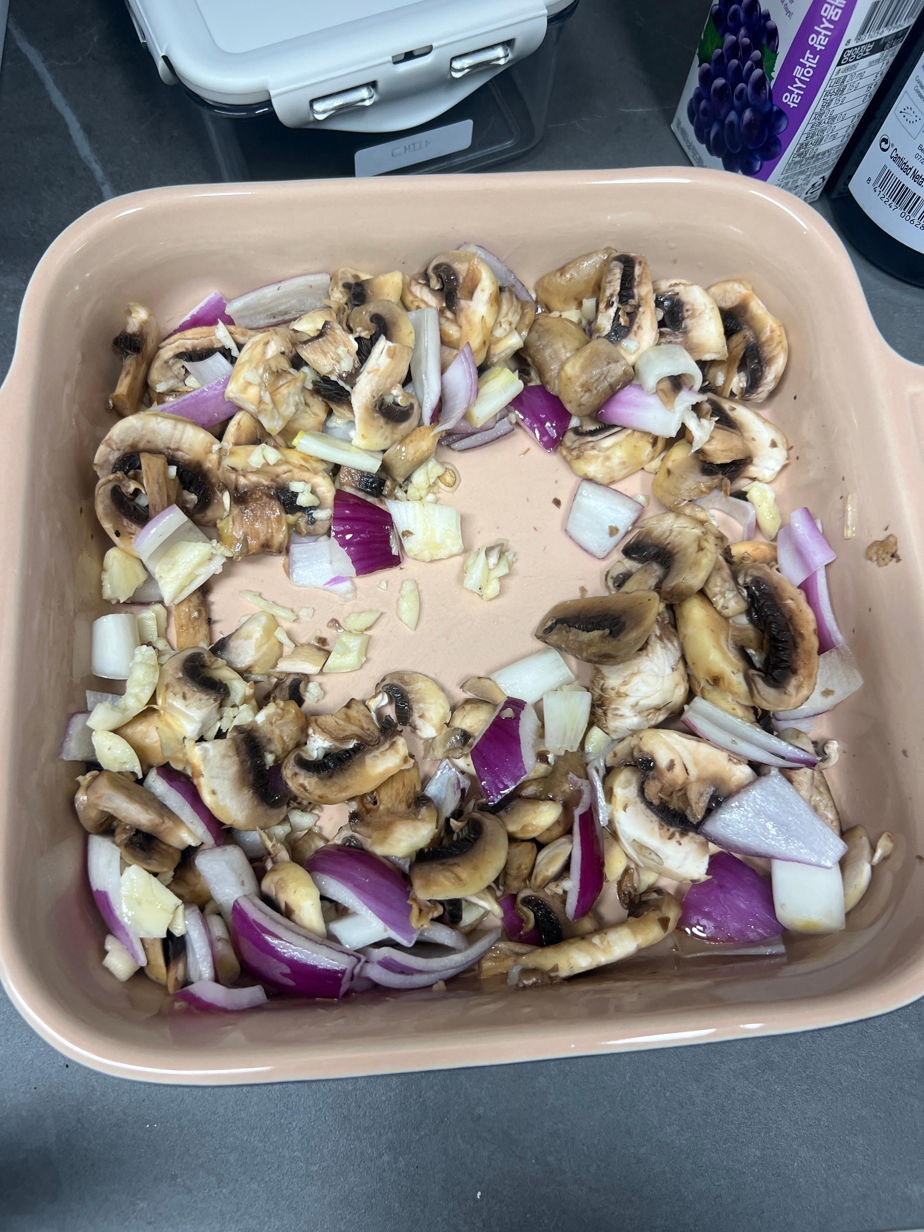 저는 양송이 남은 것, 그리고 적양파 반개 넣고, 한국인의 맛을 위해 마늘 5개를 다져서 넣었습니다.