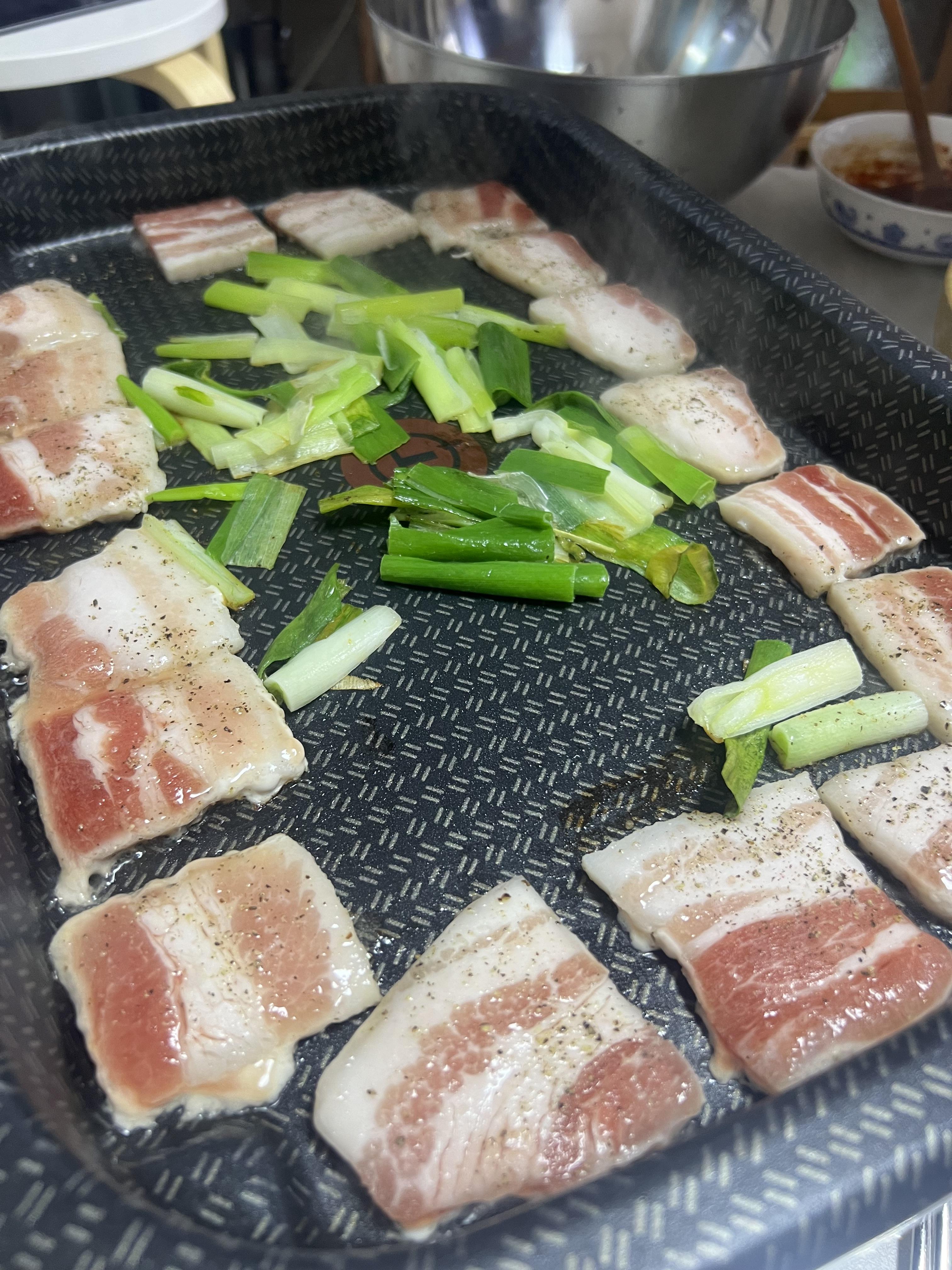 4. 삼겹살부터 굽고, 파 살짝 구워주기