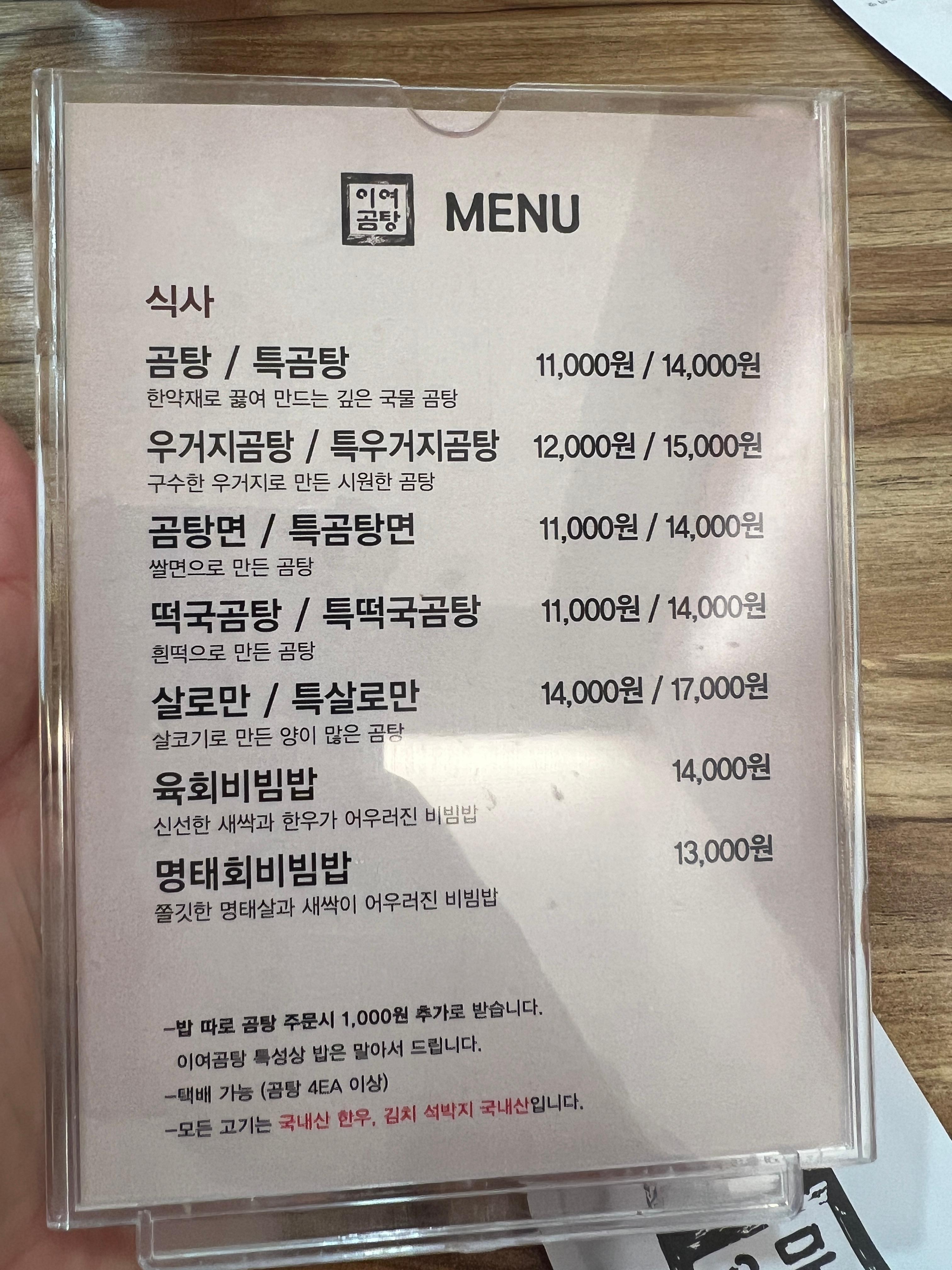 우거지 곰탕, 떡국 곰탕, 곰탕면, 심지어 육회 비빔밤까지 있었다.