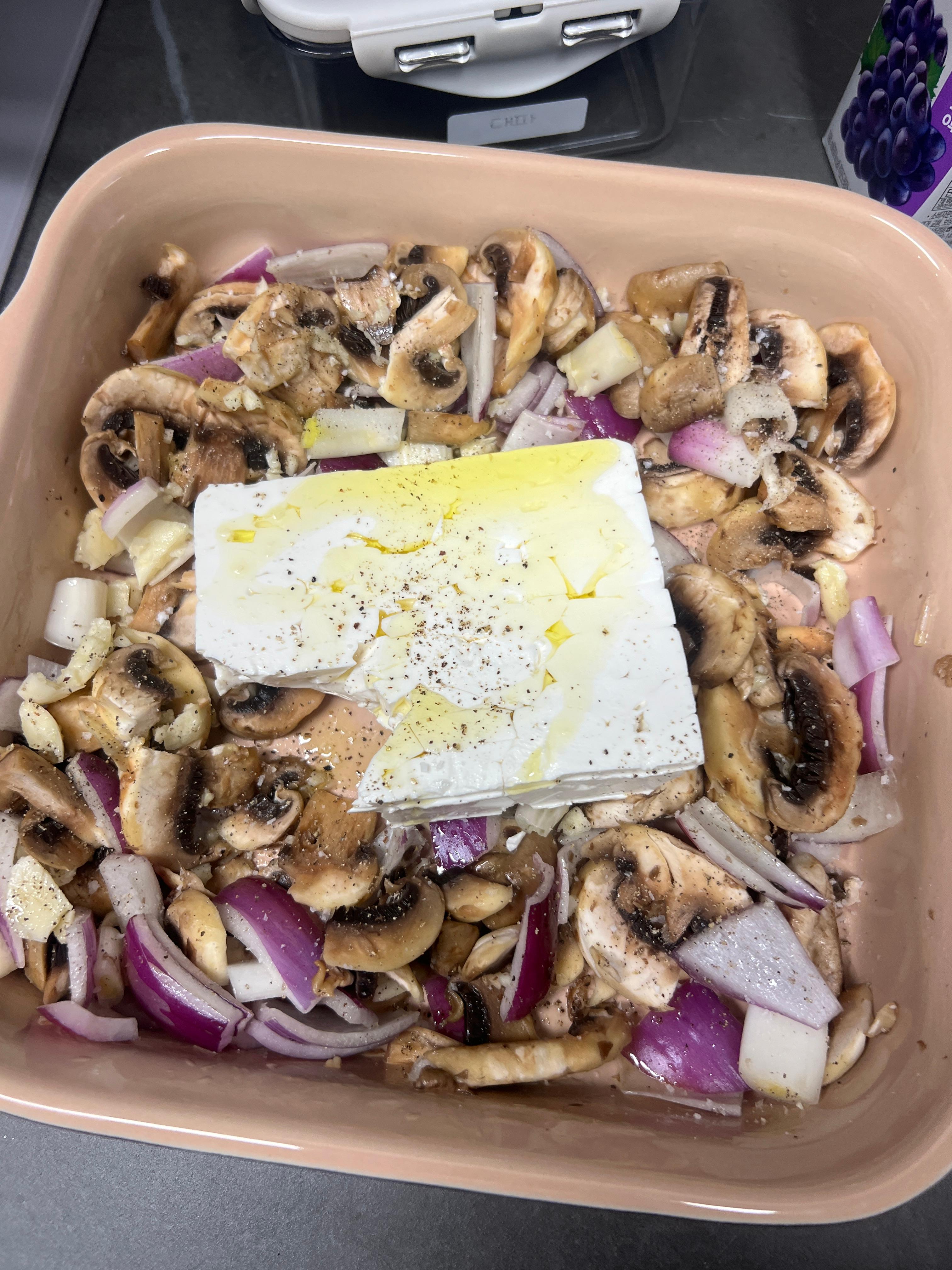 2. 페타치즈를 넣고 올리브와 소금 후추 간을 한 후에 오븐에 200도에 25분 돌린다.