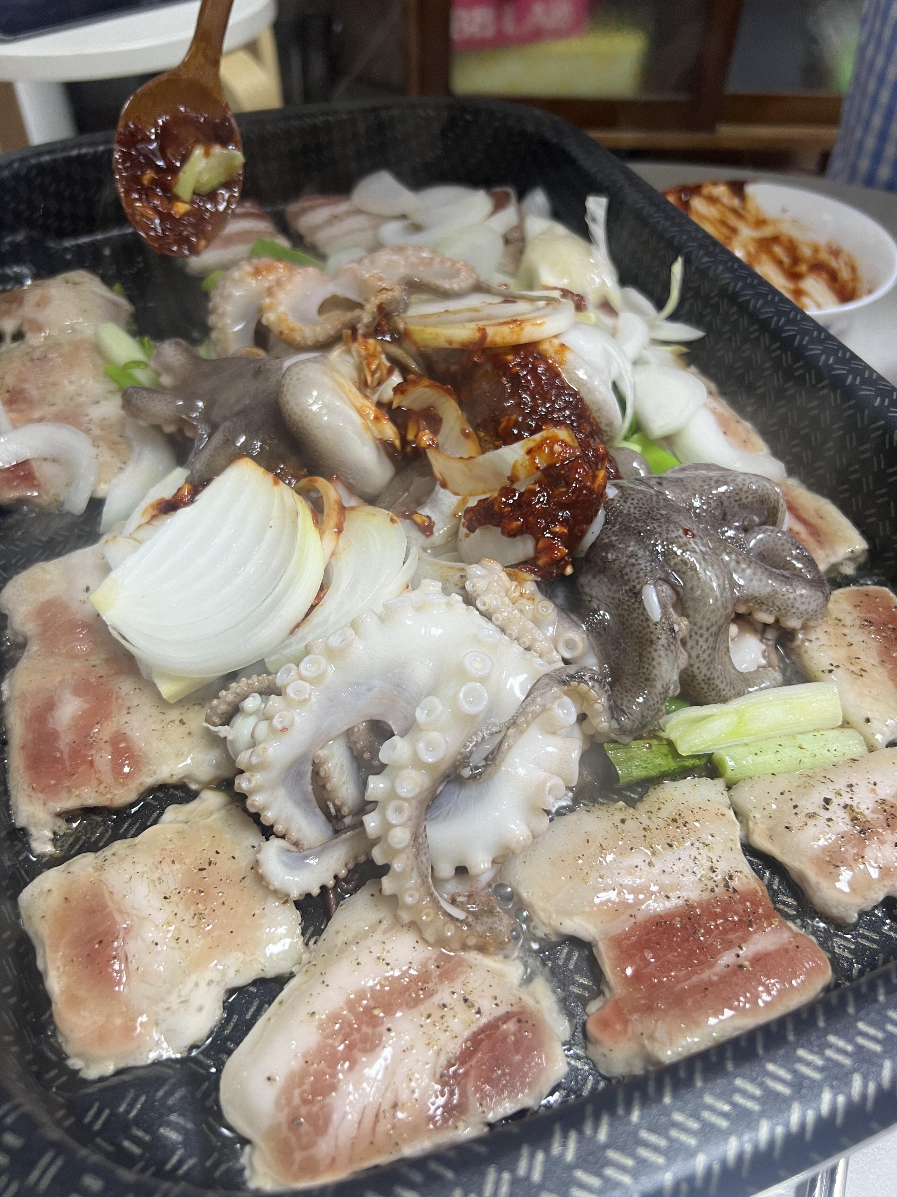 - 쭈꾸미 삽겹살 파 양파 마늘 깻잎 파 고추장 고추가루등... 양념일체
